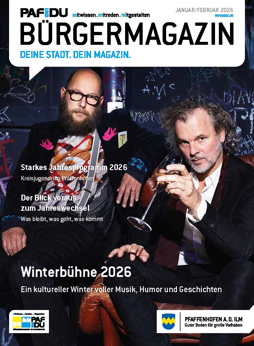 Die Pfaffenhofener Winterbühne 2026 steht im Mittelpunkt der Januar/Februar-Ausgabe. Der Leitartikel bietet einen umfassenden Überblick über alle Veranstaltungen aus den Bereichen Musik, Kabarett und Theater, die von Januar bis Ende April stattfinden. Detaillierte Informationen zum gesamten Veranstaltungsprogramm sind unter pfaffenhofen.de/winterbuehne abrufbar.