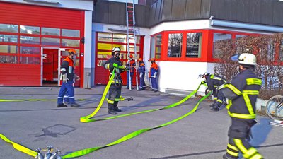 Schließlich musste noch bei der gemeinsames Gruppenübung gezeigt werden, dass das Gelernte und Geübte der vergangenen Ausbildung auch in einem Einsatzszenario sitzt. Die gestellte Aufgabe war hierbei ein Löschaufbau mit einer fingierten Brandbekämpfung auf einem Flachdach.